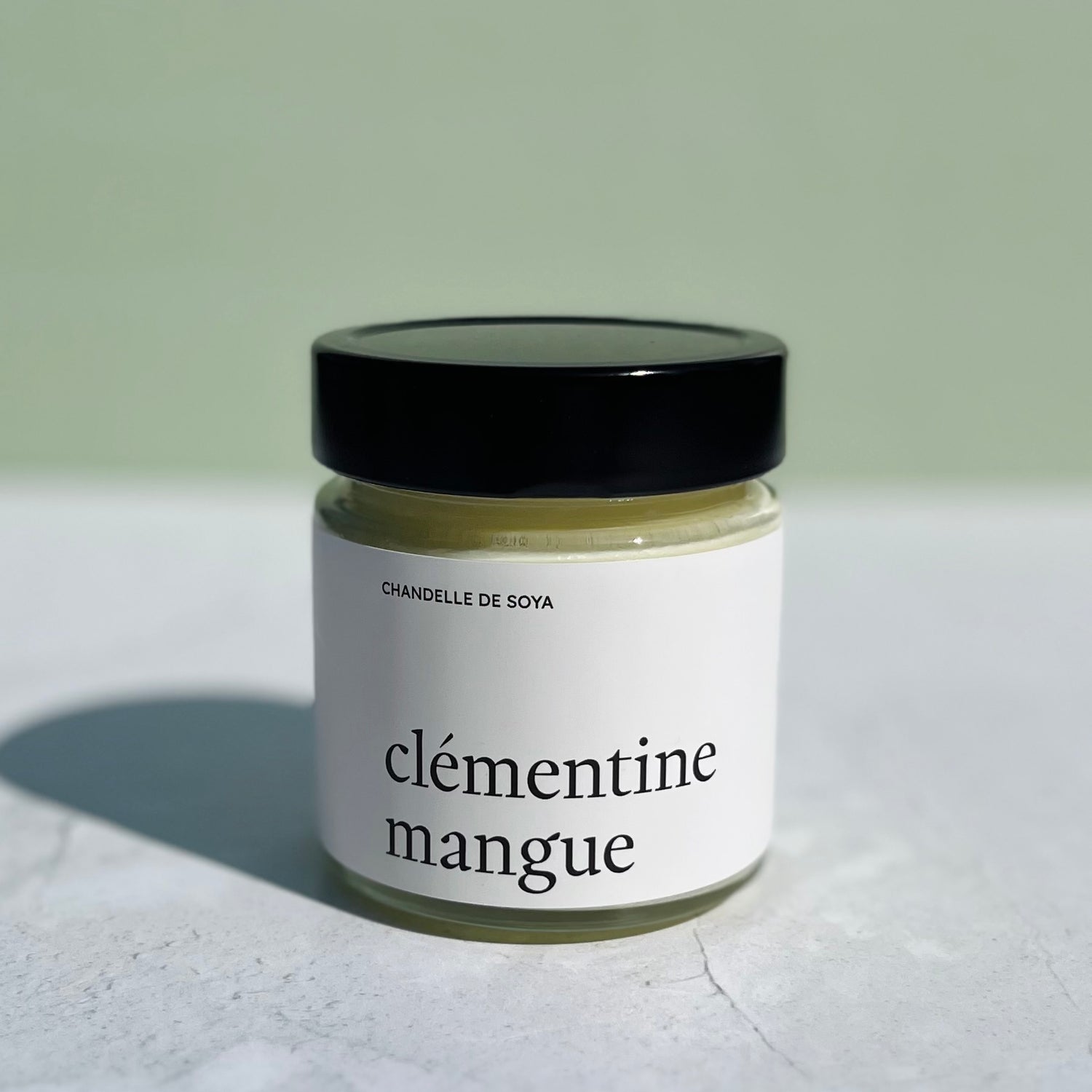 La chandelle de soya Clémentine mangue est un amalgame enivrant d'agrumes fraîchement pressés et de mangue juteuse murie à point.