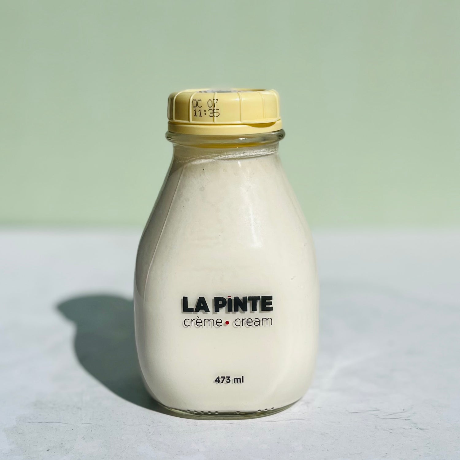 Notre crème Jersey est offerte à 10% et à 35 % de matières grasses en bouteille de verre de 473 ml.